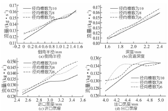 圖2為倒角半徑為1.5mm和無倒角兩種情況下的迷宮式流道靜壓云圖。由圖2可知,倒角對流道壓力分布有影響,尤其是倒角后面存在明顯的低壓區,這是因為倒角使其后面的漩渦和流道阻力變小、蒸汽的速度增大,壓力隨之降低。圖3為徑向槽數分別為10、8、6時流量隨倒角半徑、流道深度、流道進口和出口寬度的變化曲線。由圖3可知,在給定范圍內,由于流道結構復雜,計算存在一定誤差,曲線存在一定波動,但總體上流量隨倒角半徑、流道深度、進口寬度的增大而大致呈線性增長,這是因為增加流道深度和進口寬度直接影響流通面積,從而影響流量;出口寬度的流量曲線則是前期增長較快,后期則趨于平緩,這是因為流道受進口面積小的約束,蒸汽膨脹到一定程度后就不再受出口面積的影響。綜合比較而言,徑向槽數目對單個迷宮式流道的流量影響不大。