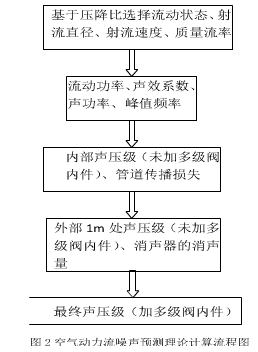 根據產品相關結構參數,按照標準IEC60534-8-3中未加多級閥內件調節閥的噪聲預測公式進行噪聲的理論計算,得到未加多級套筒閥內件調節閥所產生的噪聲值,再根據馬大猷院士的氣體消聲器理論進行多級套筒消聲量的計算,進而得到加裝多級閥內件后的調節閥最終噪聲值,其計算流程如圖2所示: