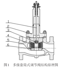 振動和噪聲普遍存在于包含可壓縮氣體的節流和排放的應用系統中。在噪聲嚴重的應用系統中,聲波振動不僅會對身體健康產生危險,而且會對設備的可靠性和系統運轉造成威脅。調節閥作為流體控制類閥門,常常應用于蒸汽、空氣等氣體的控制場合,就不可避免的要產生高噪聲,并伴隨強振動。為改善這種狀況,應用聲源處理法的多級套筒式調節閥出現。多級套筒式調節閥是一種有套筒導向的低噪音、防氣蝕調節閥,因套筒采用多級式能有效控制流體速度,避免流體對閥體及閥芯的直接沖刷,分級減壓不僅可以適應氣體節流擴散與膨脹,對控制高壓差可能出現的閃蒸和氣蝕有獨特的作用,可實現閥門在高溫高壓差工況下達到降噪降壓的效果。由于具有使作用在閥芯上的流體壓力平衡的結構,因此只須用較小的操作力便可達到穩定調節,能夠承受較高的工作壓差,使控制更加精準。其結構原理示意圖如圖1所示,1為閥桿,2為壓蓋,3為平衡閥芯,4為多級套筒,5為閥體,6為閥座。