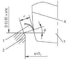 確定閥門流量系數CV值后按式(3)計算出A0,然后根據式(4)針對閥瓣某一閥瓣開度h%時計算出調節閥的閥瓣型面所形成的等效節流流路的面積A。按照圖1所示閥座密封點處畫出一條射線段使其與水平夾角為θ,長度為r。假設此點剛好為此閥瓣開度h%時閥瓣型面上的點,即此射線段所形成的圓臺側面積與A值一樣,即有