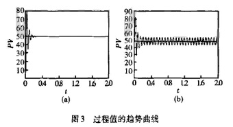 理想情況下,控制閥的摩擦引起的非線性是忽略的,其過程的趨勢曲線如圖3(a)所示。采用圖1所示的反饋控制,控制器使用常規(guī)的線性PID控制,調(diào)節(jié)閥為氣動調(diào)節(jié)閥,使用數(shù)據(jù)驅(qū)動模型來模擬實際的控制閥,數(shù)據(jù)驅(qū)動模型的參數(shù)設置為:S=5,J=2。其中S表示死區(qū)加粘連,J表示滯跳。通過仿真來得到PV和OP的時間序列,為分析控制閥的非線性提供數(shù)據(jù)。由于控制閥的模型是非線性的,導致整個控制系統(tǒng)是非線性的,而采用的控制器是線性的,這種非線性導致過程出現(xiàn)震蕩(15),其過程值的趨勢曲線如圖3(b)所示。