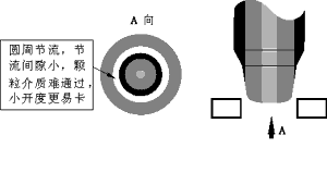 | 介質流經節流口時,在同樣的節流面積條件下,如果節流間隙小,不干凈介質不易通過, 容易堵塞;反之,則不易堵塞。對柱塞型閥芯(見圖六),它的節流面積分布在圓周上, 其節流間隙大概等于面積除以圓周長;再看窗口型閥芯(見圖七),其面積分布在窗口上 而不是在整個圓周上,所以其間隙大,顆粒很容易通過。由此可見,節流面積越集中(不是圓周分布),節流間隙越大,防堵性能就越好。這樣的典型產品有“V”型球閥、全功能超輕型調節閥等。尤其在小開度工作時,前者的節流間隙更小,更易堵卡;后者集中在“V”形口的尖端部份,面積集中,充分顯示了“V”形節流的防堵優勢。 | ||||||