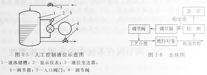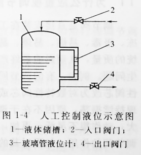 圖1-4所示是人工控制液位示意圖。液體連續不斷地通過入口閥門2流入儲槽1,同時又不斷地通過出口閥門4流出??梢钥闯?,槽內液位將隨著流入量或流出量而波動,波動嚴重時,槽內流體可能溢出或抽空。要解決這個問題,使液位保持在某一范圍內,最簡單的辦法是安裝一個玻璃管液位計3。以液位計的上、下限刻度線為標準,當液位上升到接近上限刻度時,可以開大出品閥門的開度,或關小進口閥門的開度;當液位下降到接近下限刻度時,可以關小出口中閥門或開大進口閥門的開度,這樣就避免了儲槽因液位過高而溢流,或因液位下降而抽空的事故發生,使液位保持在某一范圍內。這個過程是由人直接控制的,所以叫人工控制。