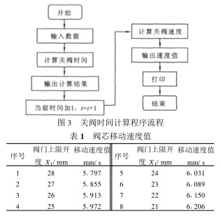由于采用手工方法計算工作量很大 , 所以采用VB 6 1 0 編程語言計算 ( 圖3)。計算得到關閥時間t =3 1 62s 。閥芯移動速度值如表 1 所示。