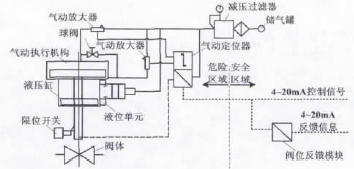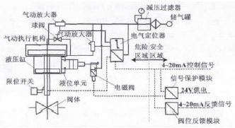 圖2 電氣定位器控制原理圖 3 現(xiàn)有調節(jié)閥安全模式 3.1 方案分析 氣動調節(jié)閥實現(xiàn)了出站壓力的調節(jié)控制,電氣定位器能夠使其在全行程上進行移動。執(zhí)行機構可以連續(xù)地做增壓或者減壓的調整,以達到較好的控制效果。但調節(jié)閥執(zhí)行機構存在故障狀態(tài)下安全模式選擇的問題。安全模式的選擇首先要保證生產的安全性,其次是生產的連續(xù)性。由于長輸管道的特殊性,要求當調節(jié)閥出現(xiàn)故障時,調節(jié)閥處于保位狀態(tài)。 3.2 保位措施 調節(jié)閥的故障狀態(tài)有斷氣、斷電和斷信號三類。 在斷氣故障狀態(tài),連接到液壓單元的氣壓信號中斷,液壓單元的內部液壓油路被關閉。由于液體是不可以壓縮的,液壓缸內的閥桿無法移動,因此執(zhí)行機構被鎖定,實現(xiàn)保位功能。由于供氣管線安裝有壓力變送器,當調節(jié)閥出現(xiàn)斷氣故障時,站控制系統(tǒng)發(fā)出氣源壓力低報警信號,提醒工作人員及時處理并檢查調節(jié)閥狀態(tài)信息。 在斷電故障狀態(tài),由于控制系統(tǒng)電源采用在線式不間斷電源(UPS)供電,且后備電池時間為2h,因此調節(jié)閥不考慮斷電時的保位措施。 在斷信號故障狀態(tài),DVC6010無法切斷液壓單元的氣壓信號,因此無法實現(xiàn)保位功能。 4 改造后調節(jié)閥安全模式 針對斷信號故障狀態(tài)下無法實現(xiàn)保位功能的問題,對調節(jié)閥執(zhí)行機構進行改造。在電氣定位器和執(zhí)行機構之間加裝電磁閥,控制室增加信號保護模塊,實現(xiàn)調節(jié)閥斷信號保位功能。改造后調節(jié)閥控制原理圖如圖3所示。